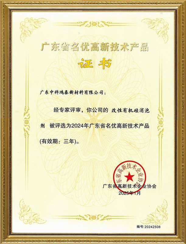 經(jīng)廣東省高新技術(shù)企業(yè)協(xié)會嚴格評審,廣東中科鴻泰新材料有限公司自主研發(fā)的“環(huán)保型洗滌消泡劑”與“改性有機硅消泡劑”兩款核心產(chǎn)品,成功榮獲“廣東省名優(yōu)高新技術(shù)產(chǎn)品”證書。這一權(quán)威認證,標志著中科鴻泰在消泡劑領(lǐng)域的技術(shù)創(chuàng)新實力、產(chǎn)品質(zhì)量水平及市場競爭力獲得了省級層面的高度認可。